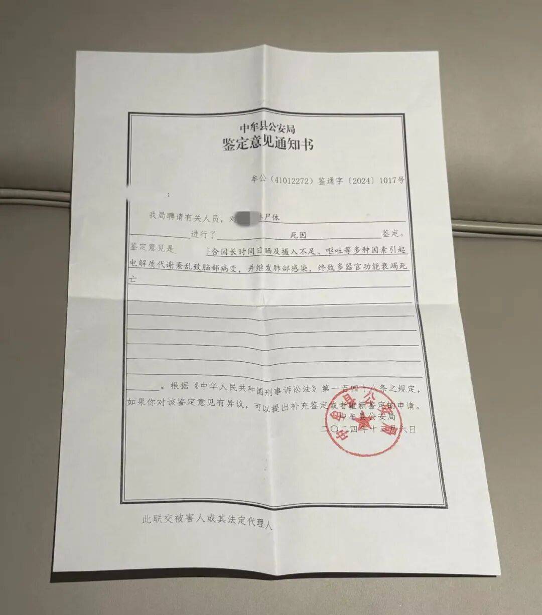 当地公安局出具的对王琳死因的鉴定意见通知书。受访者供图