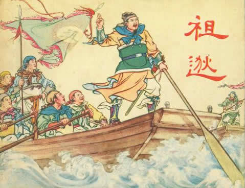 建兴元年(313年),祖逖率领100多部属渡江北上。船到江心的时候,祖逖站立船头,感慨万千,不禁用木楫击打着船舷,发誓道:祖逖不能收复中原,就再也不过长江了。意思即战死在沙场决不生还。他的激昂豪壮气概,使随行的壮士们振奋。