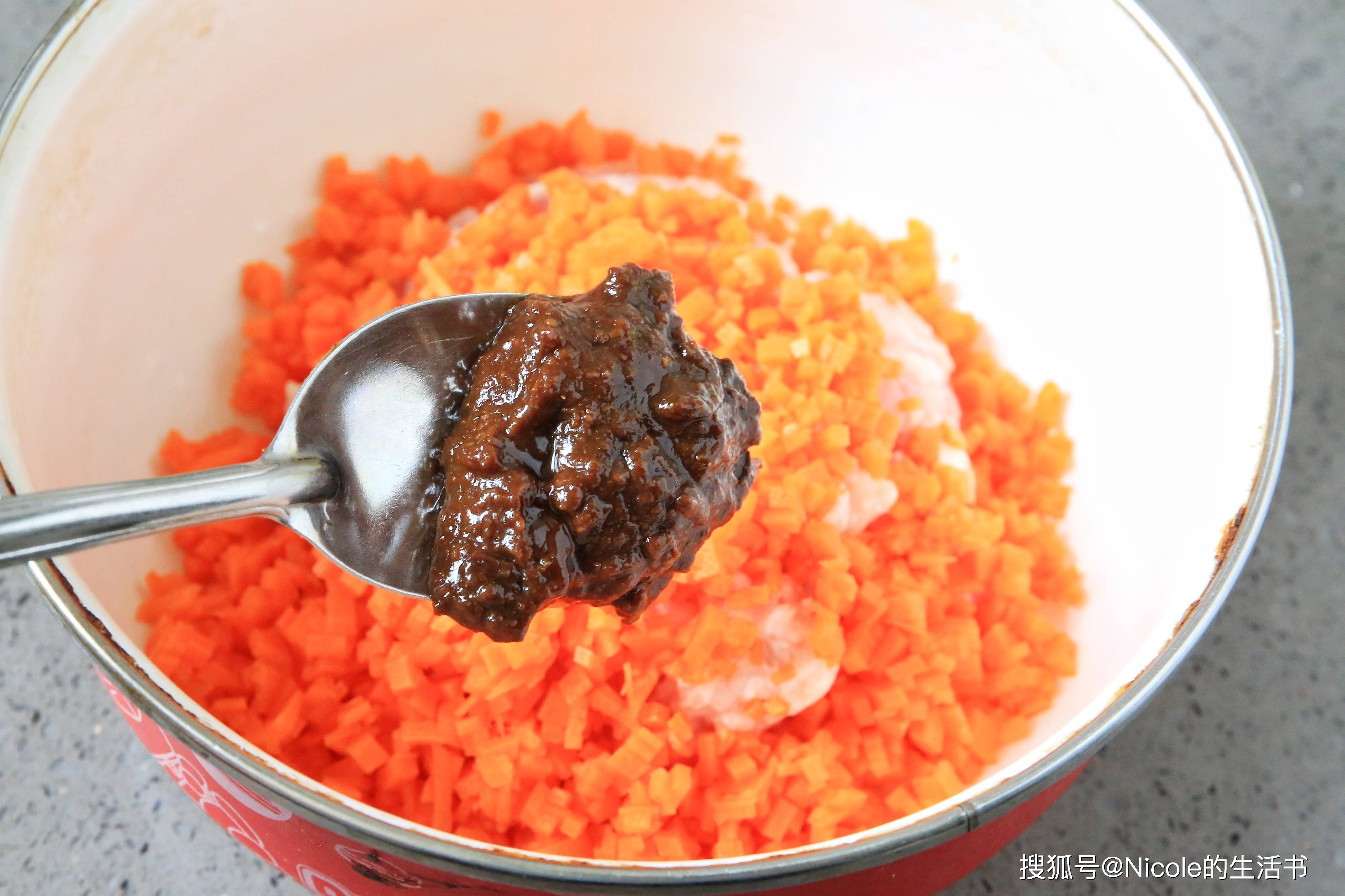 豆瓣酱的加入,是这道菜的灵魂点睛之笔,与肉馅的鲜嫩、胡萝卜碎的清甜交织在一起,顺着一个方向搅拌上劲的动作,是食材的融合,更是口感的加持。