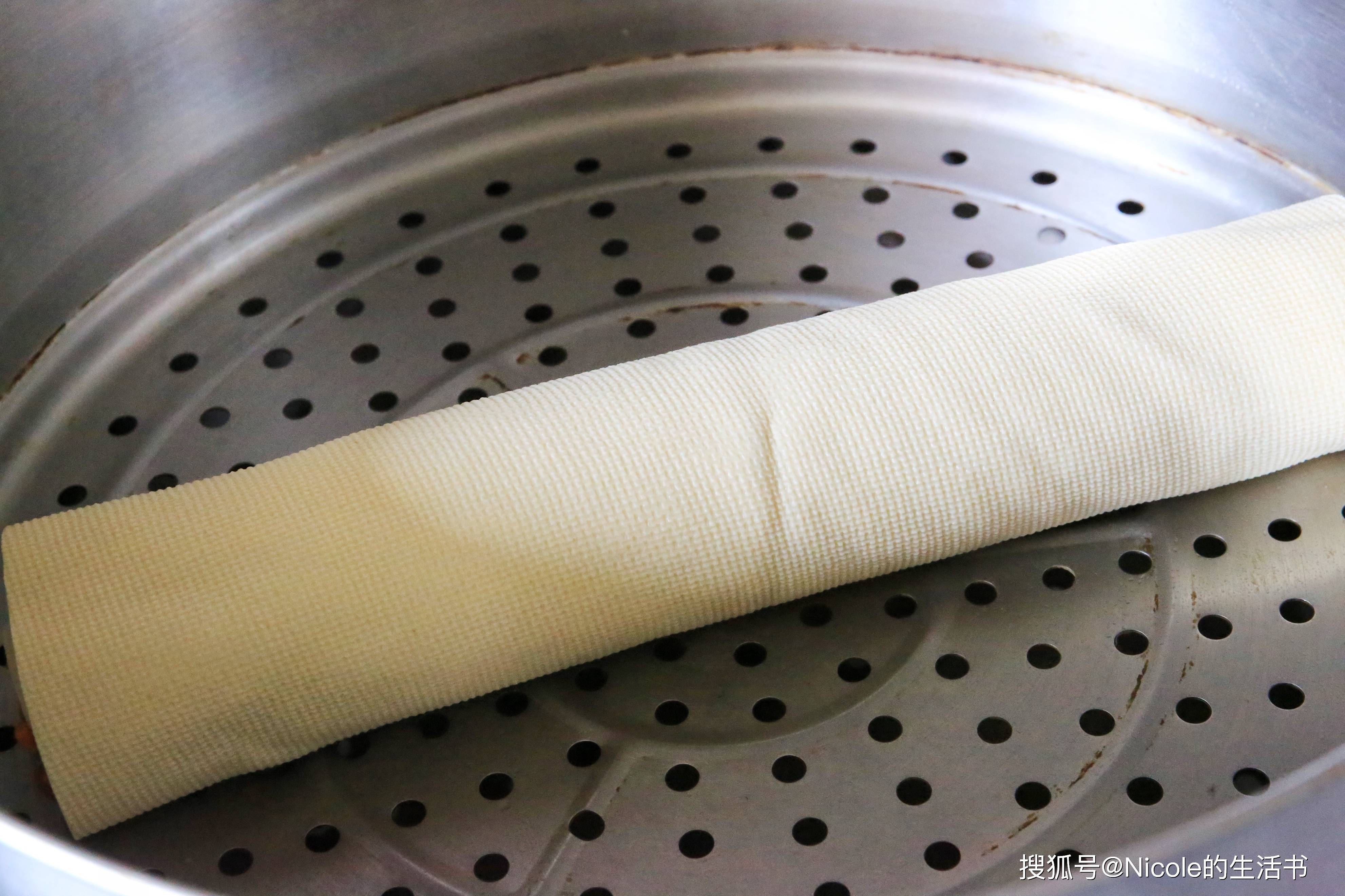 6、卷好的千张放入锅中,冷水上锅,蒸15分钟左右;